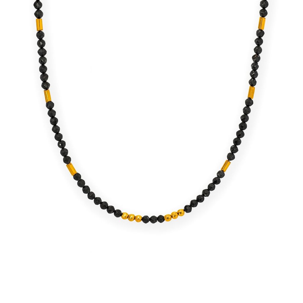 Odkryj elegancję w najczystszej formie. Naszyjnik wykonany z drobnych, fasetowanych koralików czarnego onyksu zachwyca subtelnym blaskiem i ponadczasowym stylem. Złote elementy dodają mu delikatnej luksusowej nuty, tworząc biżuterię, która sprawdzi się zarówno na co dzień, jak i na wyjątkowe okazje.