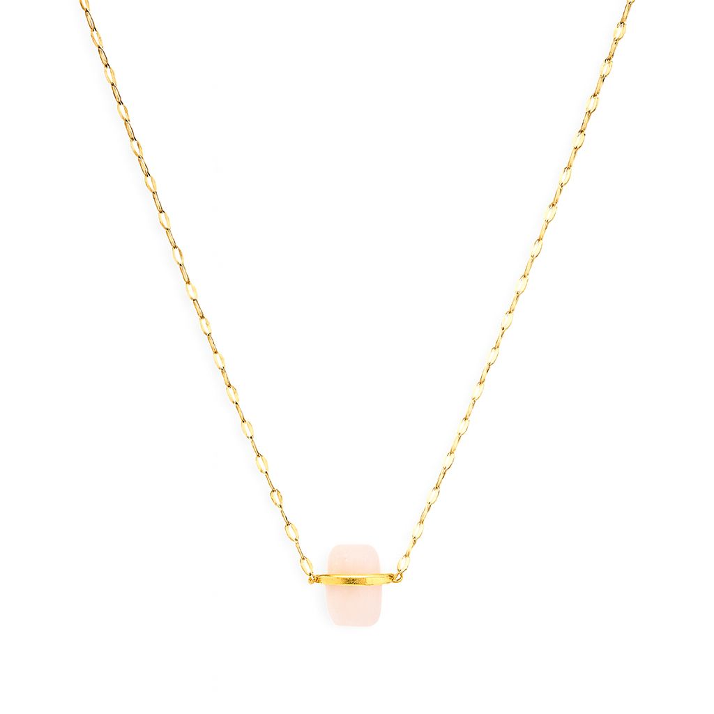 Minimalistyczny naszyjnik z delikatnego łańcuszka w kolorze złota, ozdobiony naturalnym kwarcem różowym w eleganckiej, geometrycznej formie. To wyjątkowy dodatek, który łączy prostotę z pozytywną energią kamieni. Jego subtelny design sprawia, że świetnie pasuje do każdej stylizacji – od codziennych, po bardziej eleganckie.