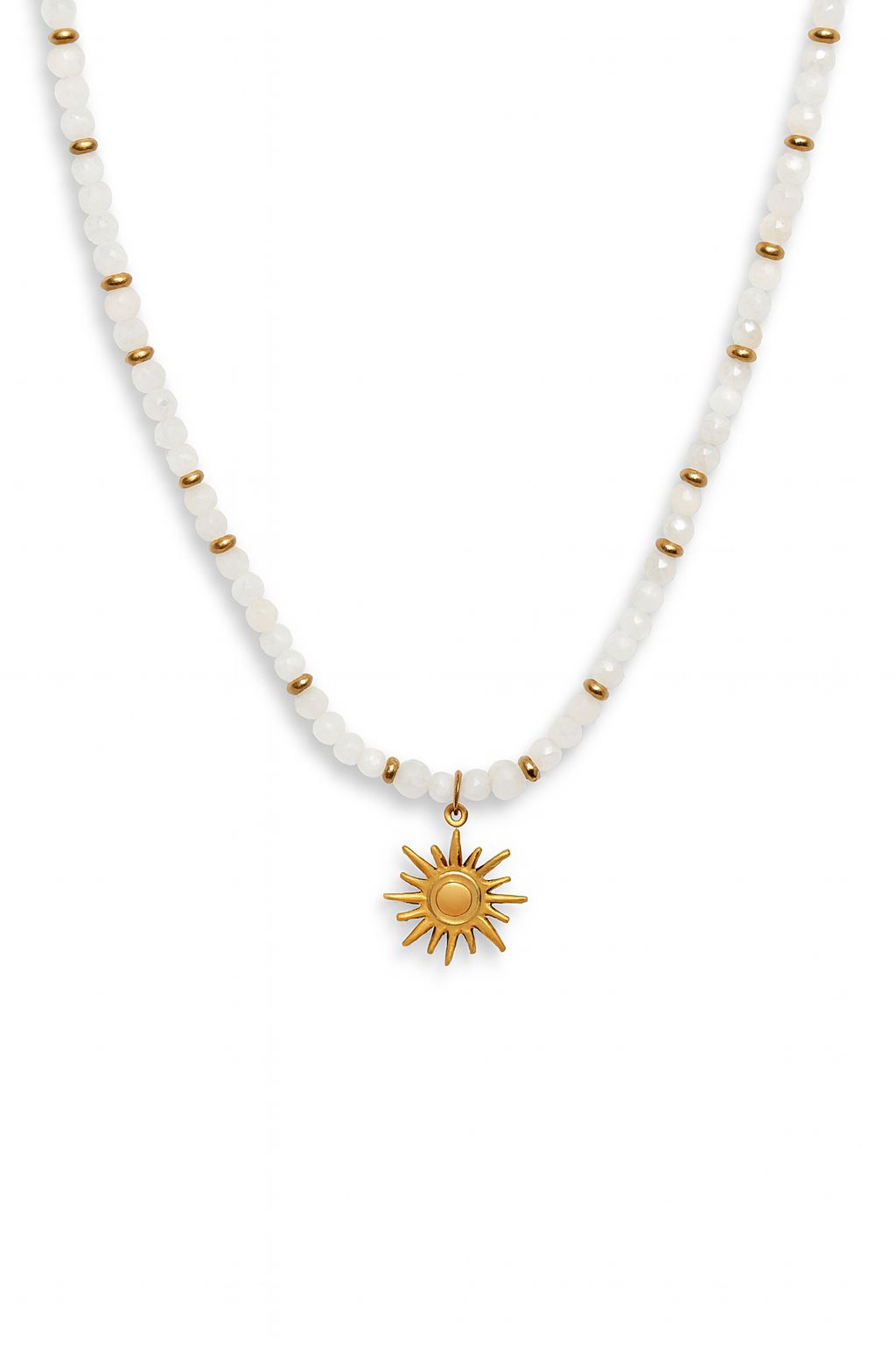 Delikatny i elegancki naszyjnik wykonany z naturalnego kwarcu mlecznego ozdobiony złotymi przekładkami oraz wyjątkową zawieszką w kształcie promiennego słońca.